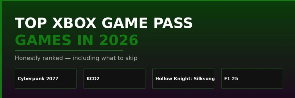 The titles that matter in 2026: Cyberpunk 2077, Kingdom Come: Deliverance 2, Hollow Knight: Silksong, and F1 25 for the racing crowd. Between those four, you have well over 200 hours of quality content. The rest of the Xbox Game Pass games are worth exploring on your own terms — but don’t let the library’s size intimidate you into paralysis.